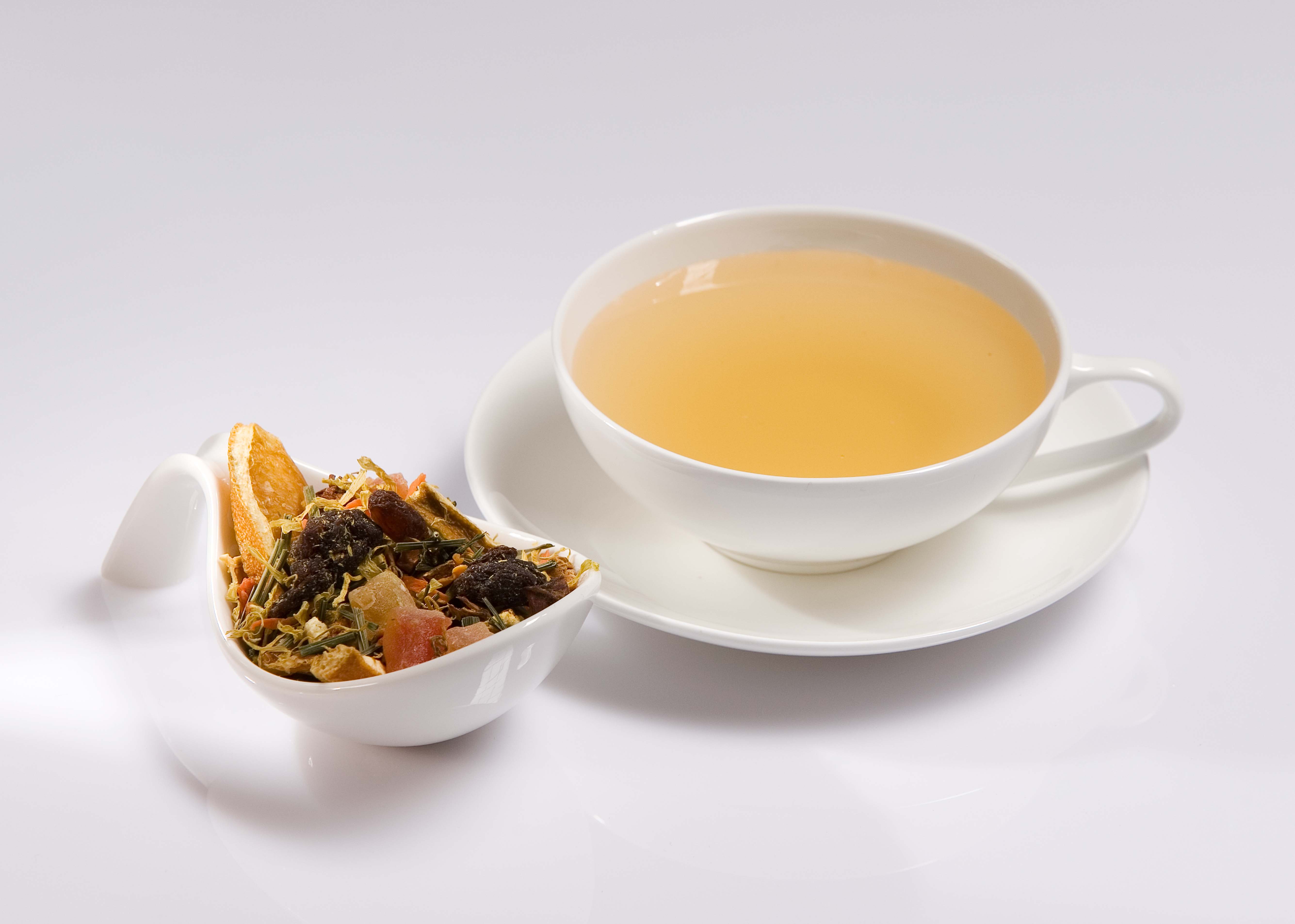 Zutaten: Apfelstücke, Weinbeeren, Papayawürfel, Orangenschalen, Karaottenschalen, Lemongras, Orangenecken, natürliches Aroma und Ringelblumenblüten.