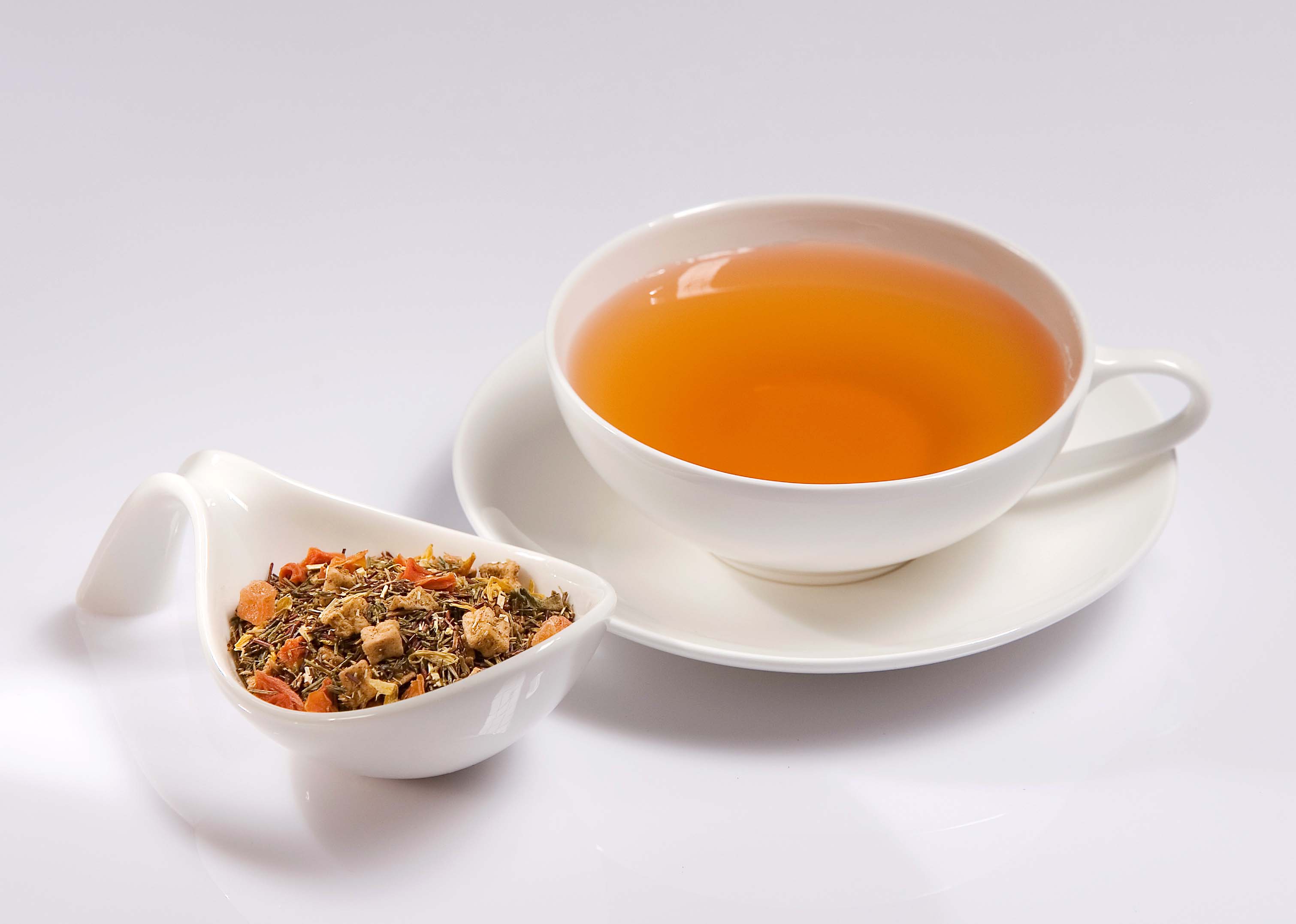 Ein Rotbuschtee mit Passionsfrucht-Geschmack. Zutaten: Grüner Rooibos/Rotbusch, Karottenflocken, Apfelstücke, Aroma, Papayastücke und Ringelblumen.