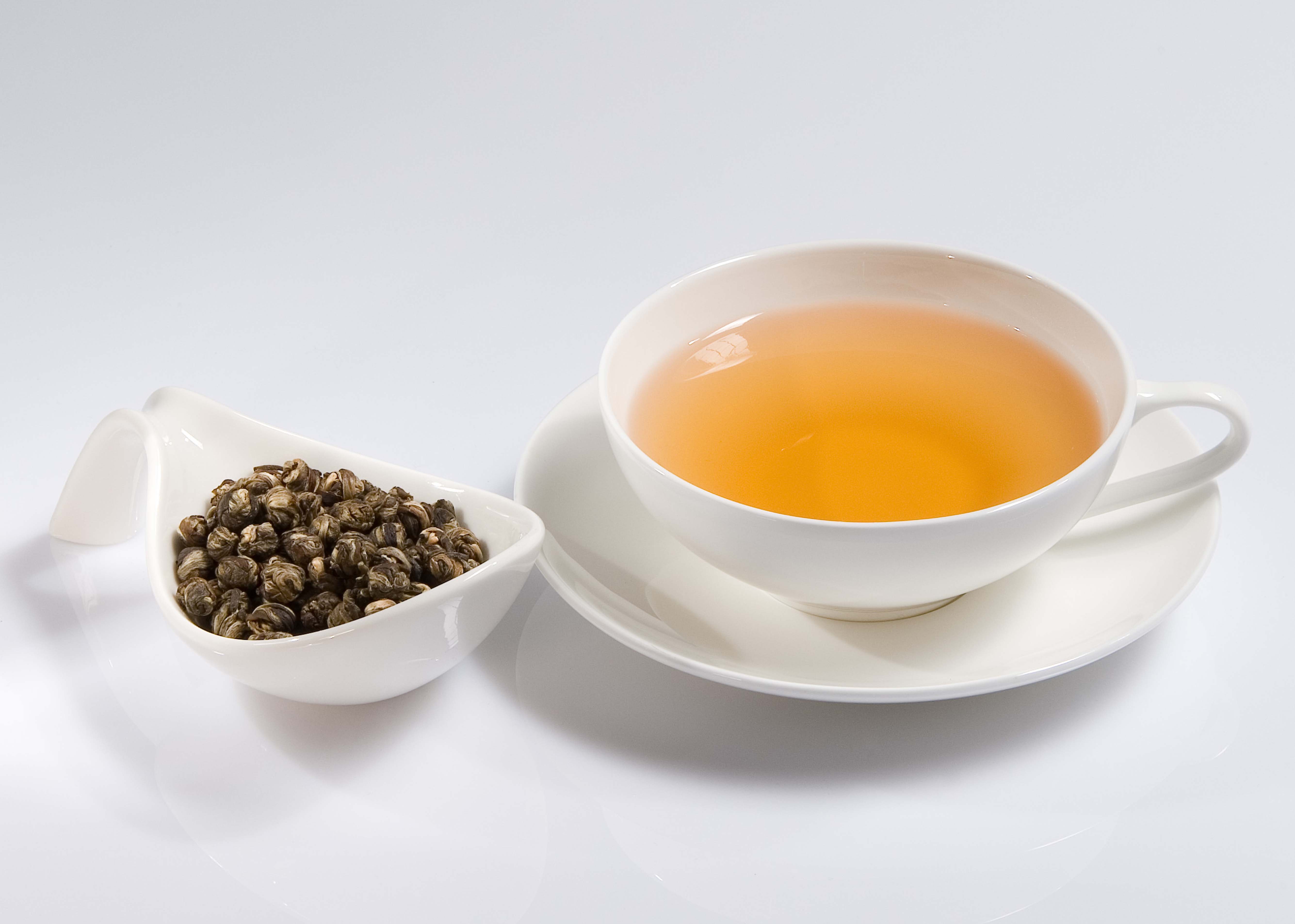 Auch dieser Tee gehört in die Kategorie der Downys. Das noch feuchte frische Blattgut wird bis zu 5 mal mit frischen, fein duftenden Jasminblüten vermengt, gesiebt und per Hand zu kleinen Perlen gerollt. Das Blatt umschließt so das feine Jasmin-Aroma und lässt es erst während des Aufgusses wieder frei. Die Teefarbe führt einen geheimnissvollen champagnerfarbenden Ton.